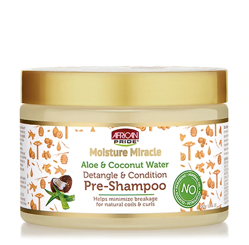 The African Pride Moisture Miracle Aloe & Coconut Water Pre-Shampoo uses the natural benefits of Aloe Vera and Coconut Water to condition, protect and remove tangles from natural coils and curls; leaving hair soft and easy to manage during cleansing and styling.