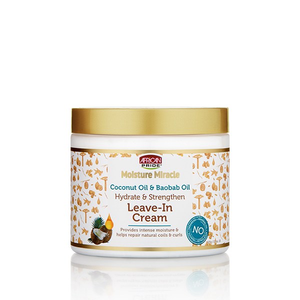 The African Pride Moisture Miracle Leave-In Cream is a deep penetrating leave-in conditioning cream uses a nourishing blend of Coconut Oil & Baobab Oil to impart lasting moisture while helping to protect against breakage. Leaving coils and curls manageable, hydrated and strong.