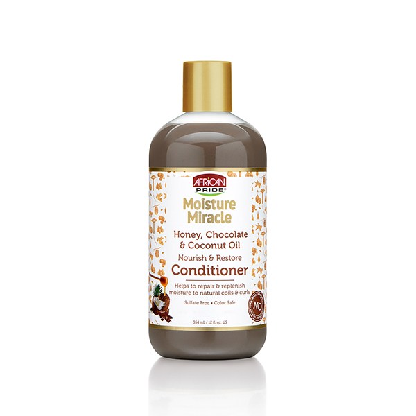 The African Pride Moisture Miracle Honey, Chocolate & Coconut Oil Conditioner uses the natural conditioning benefits of Honey and Coconut Oil, with the restorative benefits of Chocolate (Cacao) to transform dry coils and curls leaving them hydrated and nourished.