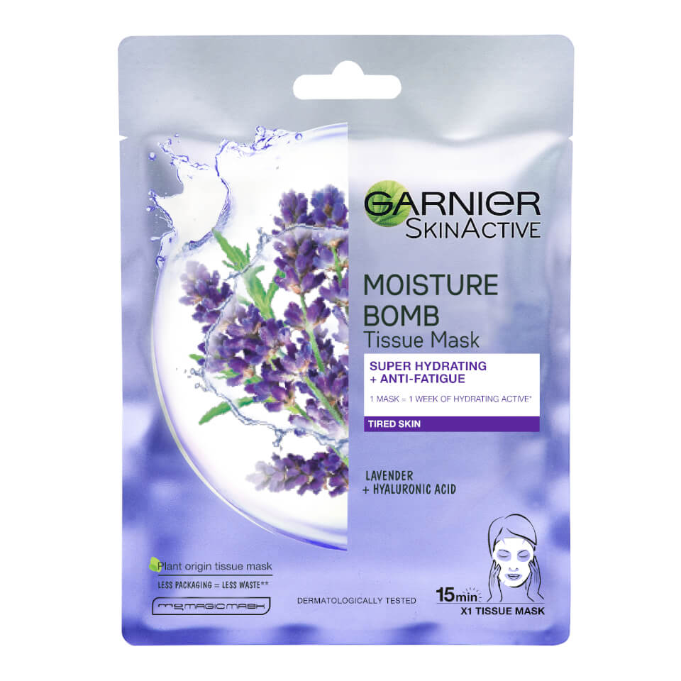 Treat tired skin to the Garnier Moisture Bomb Lavender Hydrating Face Sheet Mask; a rejuvenating, 15-minute mask with a pleasant, relaxing scent to pamper the senses.