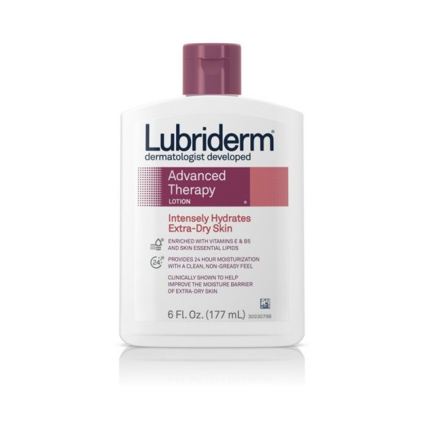 Lubriderm Advanced Therapy Lotion Intensely Hydrates Extra-Dry Skin 6 Oz Lubriderm Advanced Therapy deeply hydrates extra-dry skin. We believe everyone deserves to have healthy, comfortable skin. Lubriderm, the brand developed by dermatologists, offers specialized formulations with essential nutrients naturally found in healthy skin. Lubriderm Advanced Therapy Moisturizing Lotion is our solution for your extra-dry skin and will leave your skin soothed and deeply moisturized. This non-greasy formula, which contains vitamins E and B5 and skin essential lipids naturally found in healthy skin, replenishes and strengthens your skin’s moisture barrier. Clinically shown to moisturize extra-dry skin for 24 hours, and transform extra-dry skin into healthier-looking, resilient skin in just one week.