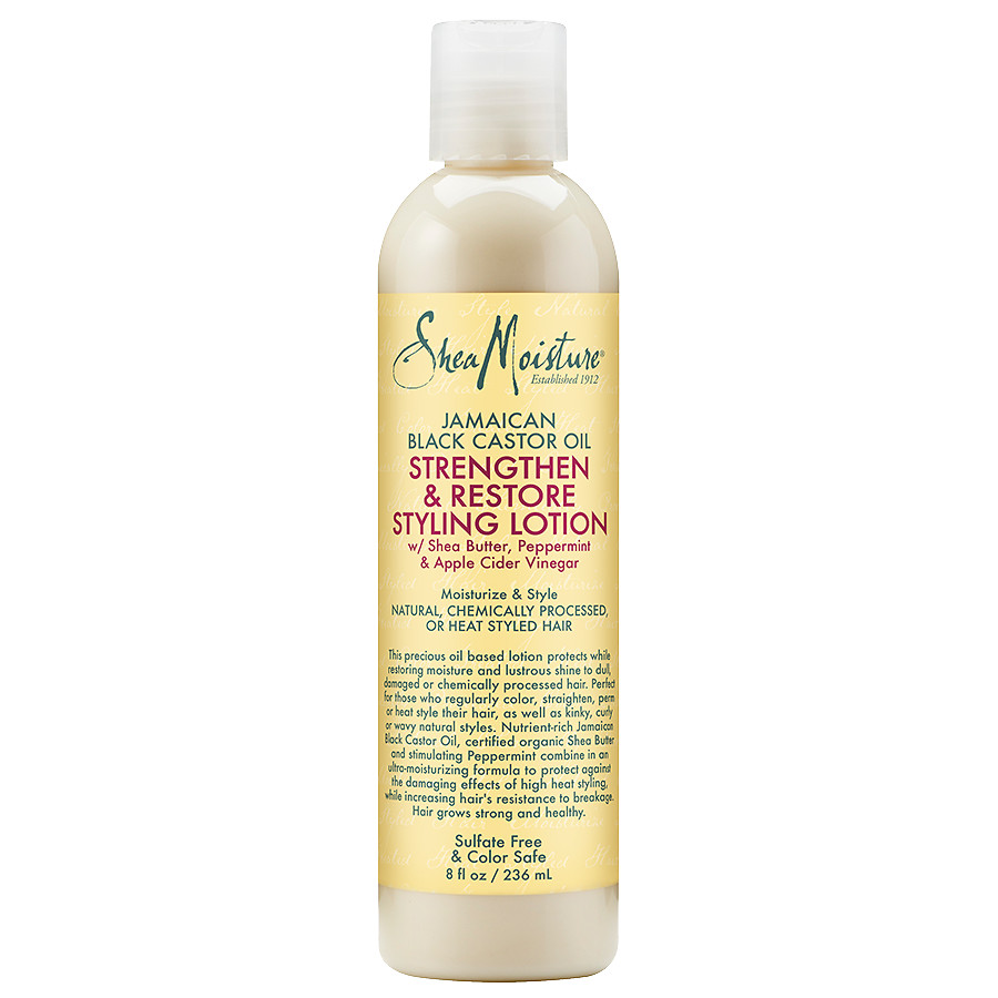 SheaMoisture Jamaican Black Castor Oil Strengthen, Grow & Restore Styling Lotion is an oil-based lotion that protects hair while restoring moisture and shine. Its ultra-moisturizing formula protects against the damaging effects of heat styling. It increases hair’s resistance to breakage, so hair can grow strong and healthy.