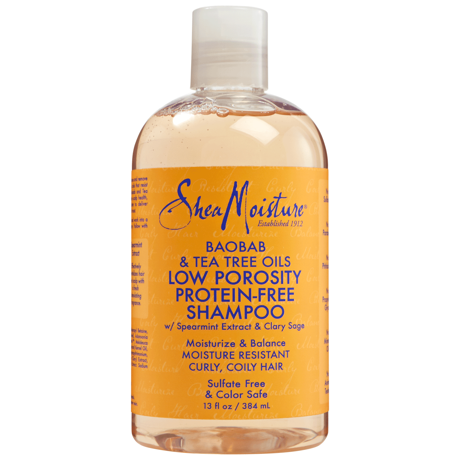 SheaMoisture Baobab & Tea Tree Oils Low Porosity Protein-Free Shampoo is a sulfate-free clarifying shampoo that gently cleanses and removes product build-up. Ideal for low porosity curls and coils that resist essential moisture. Infused with fast-absorbing Baobab and Tea Tree Oils, enriched with certified organic Shea Butter to boost scalp health and deliver nourishing hydration beyond the outer cuticle layer. Refreshing Spearmint invigorates the scalp for a stimulating experience, while Clary Sage gives hair a silky shine.