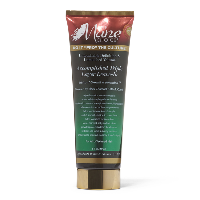 Do It “FRO” The Culture! Untouchable Definition & Unmatched Volume ACCOMPLISHED Triple Layer Leave-In is a nutrient-rich multi-action formula. Provides an extended release layer of detangling properties to help alleviate knots & tangles immediately and overtime. It also provides an additional layer to protect the hair and deliver maximum moisture, seal & smooth cuticles to boost shine and help reduce moisture loss. Leaving the hair super soft and extremely silky. The final layer provides hydrating properties to lock in lasting moisture and fortifies the hair to improve elasticity & overall integrity.