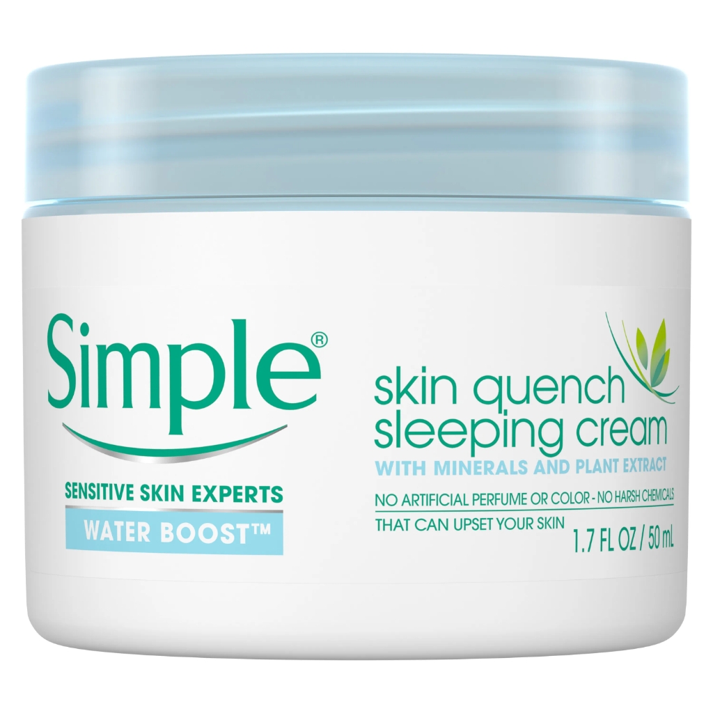 Simple Water Boost Skin Quench Sleeping Cream transforms dull and tired skin, replenishing dehydrated skin while you sleep! It works naturally with skin, for instant and continuous hydration throughout the day. This silky, lightweight moisturizer is made with a plant extract and skin-essential minerals. With regular use, it boosts skins natural hydration process, for health-looking skin. Specially formulated for dehydrated, dry skin, Simple Water Boost Skin Quench Sleeping Cream contains no harsh chemicals, artificial colors, dyes, or perfume, making it perfectly suitable for even sensitive skin